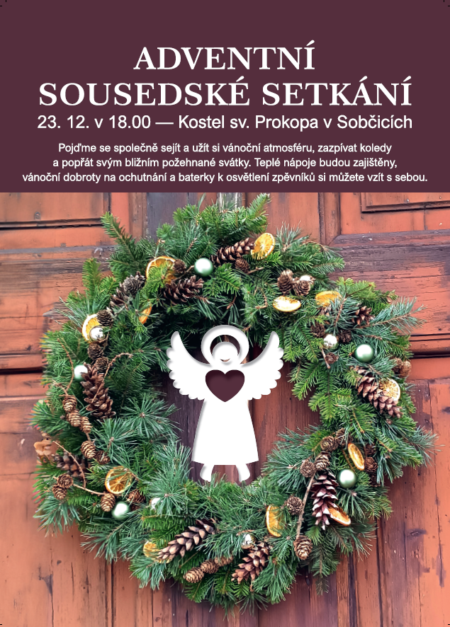 Pozvánka Jste zváni na Adventní sousedské setkání, které proběhne 23.12.2024 od 18hod. v kostele sv. Prokopa v Sobčicích.
